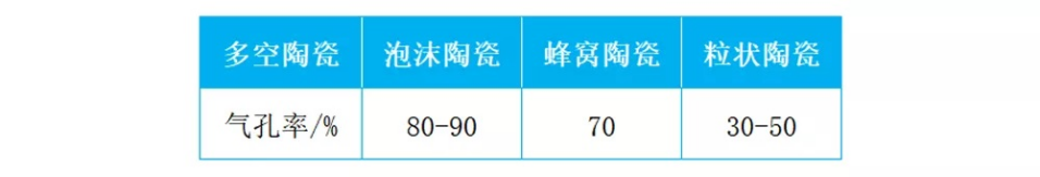 多孔陶瓷是一种含有一定量空隙的无机非金属粉末烧结体,与其他无机非金属(致密陶瓷)的根本区别在于其是否含有空隙(气孔)及含有多少体积百分比的空隙(气孔)。根据成孔方法和空隙,多孔陶瓷可分为:泡沫陶瓷、蜂窝陶瓷、粒状陶瓷,其对应气孔率见下表。